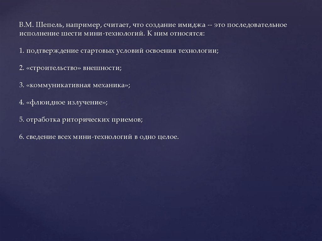 В.М. Шепель, например, считает, что создание имиджа -- это последовательноеисполнение шести мини-технологий. К ним относятся: