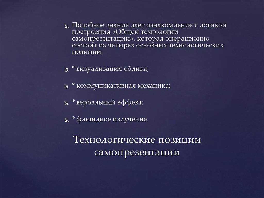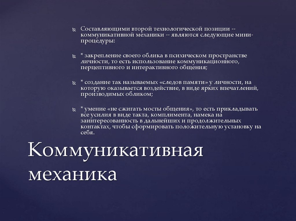 Составляющими второй технологической позиции -коммуникативной механики -- являются следующие минипроцедуры:* закрепление своего облика в психическом пространстве