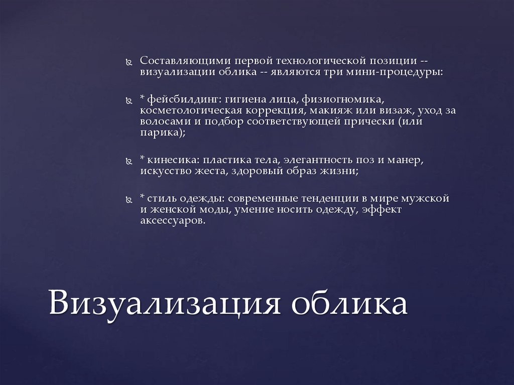 Составляющими первой технологической позиции -визуализации облика -- являются три мини-процедуры:* фейсбилдинг: гигиена лица, физиогномика,