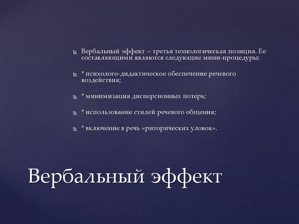 Вербальный эффект -- третья технологическая позиция. Еесоставляющими являются следующие мини-процедуры: