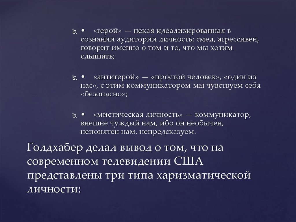 • «герой» — некая идеализированная всознании аудитории личность: смел, агрессивен,