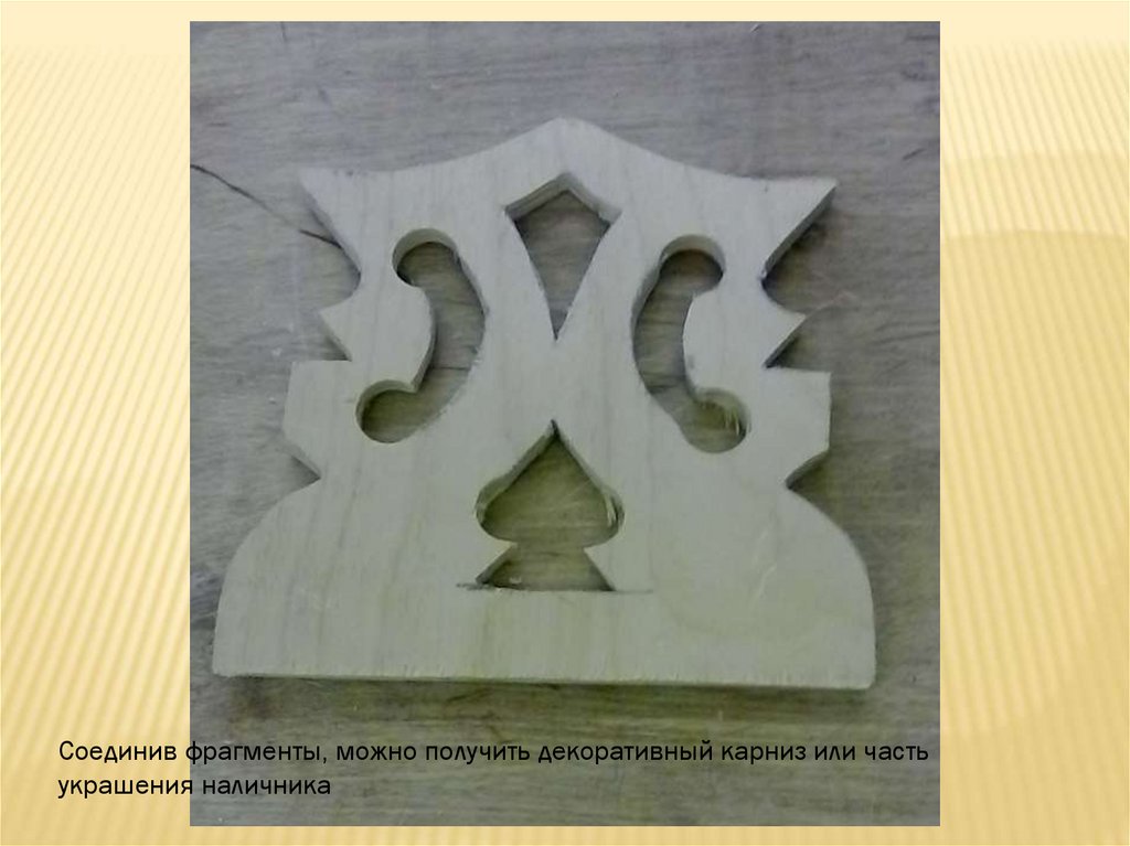 Соединив фрагменты, можно получить декоративный карниз или частьукрашения наличника