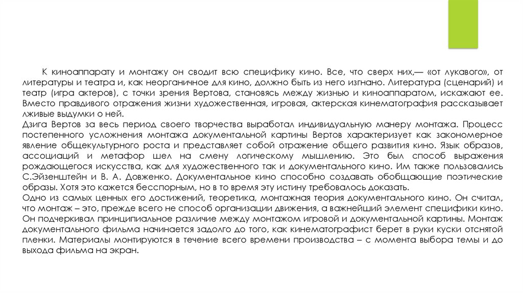 Он подчеркивал принципиальное различие между монтажом игровой и документальной картины. Монтаж