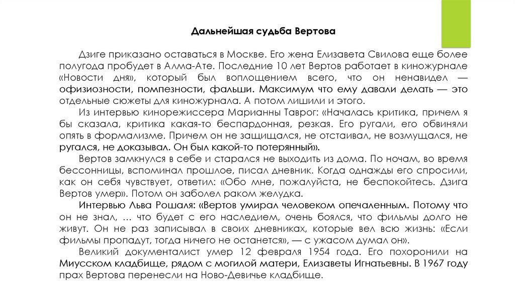 Вертов умер». Потом он заболел раком желудка.
