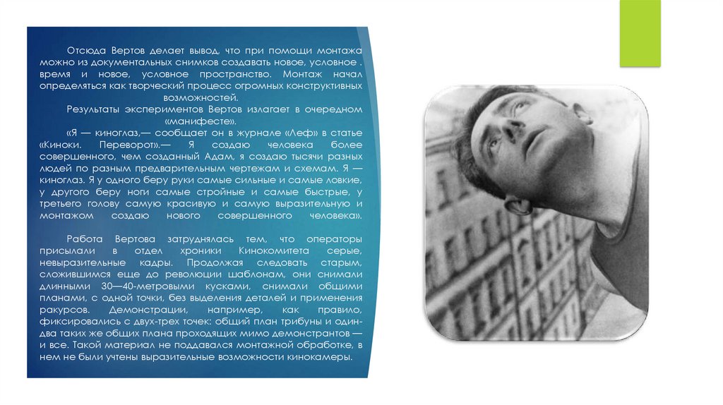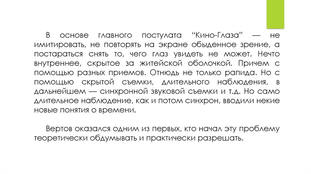В основе главного постулата “Кино-Глаза” — неимитировать, не повторять на экране обыденное зрение, а