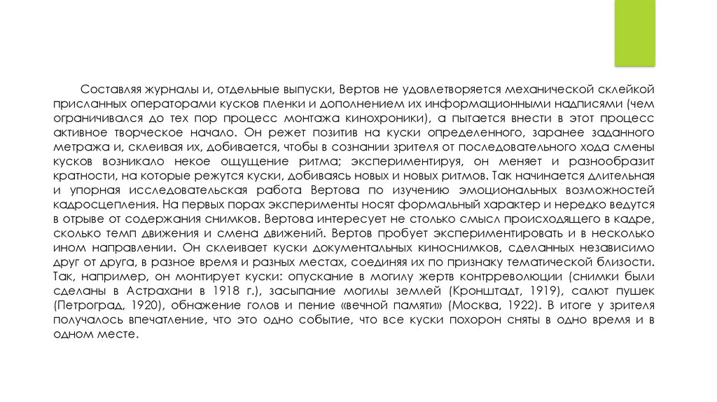 постепенного усложнения монтажа документальной картины Вертов характеризует как закономерное