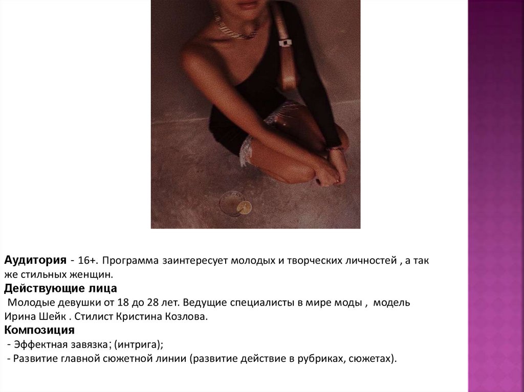 Аудитория - 16+. Программа заинтересует молодых и творческих личностей , а также стильных женщин.