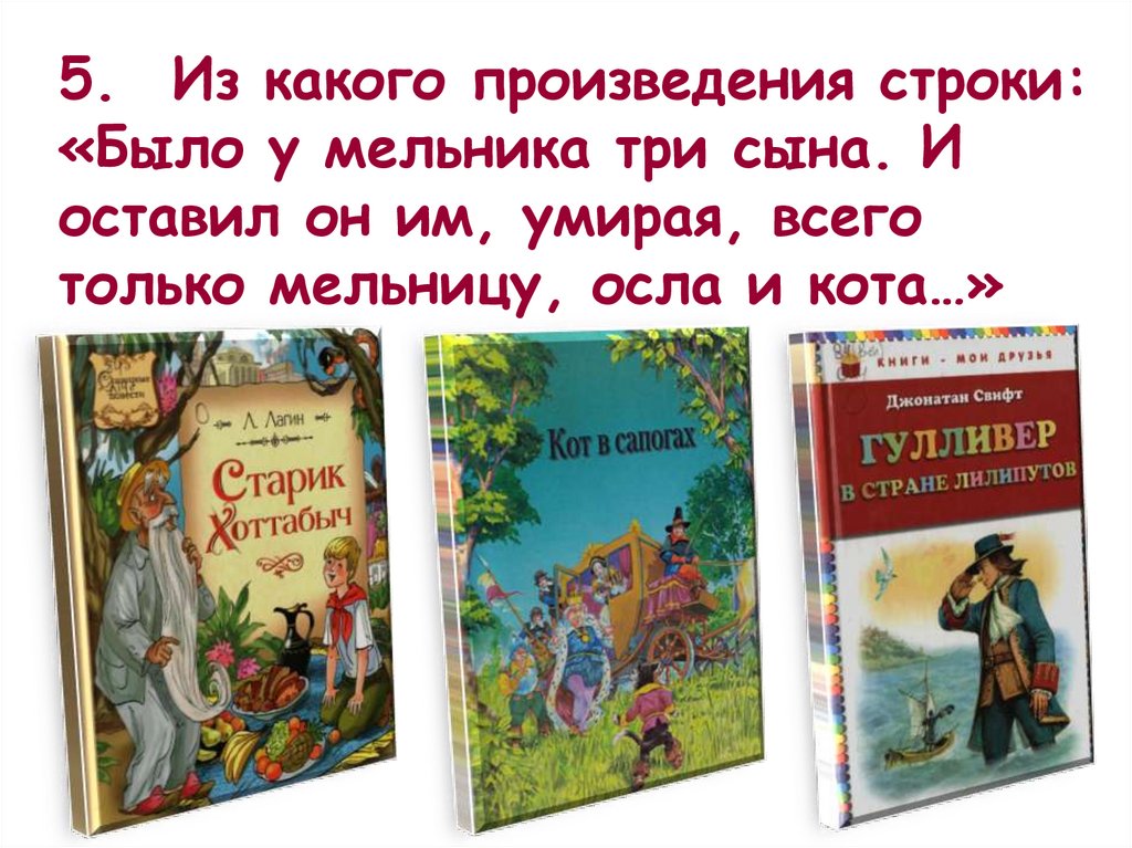 5. Из какого произведения строки:«Было у мельника три сына. И