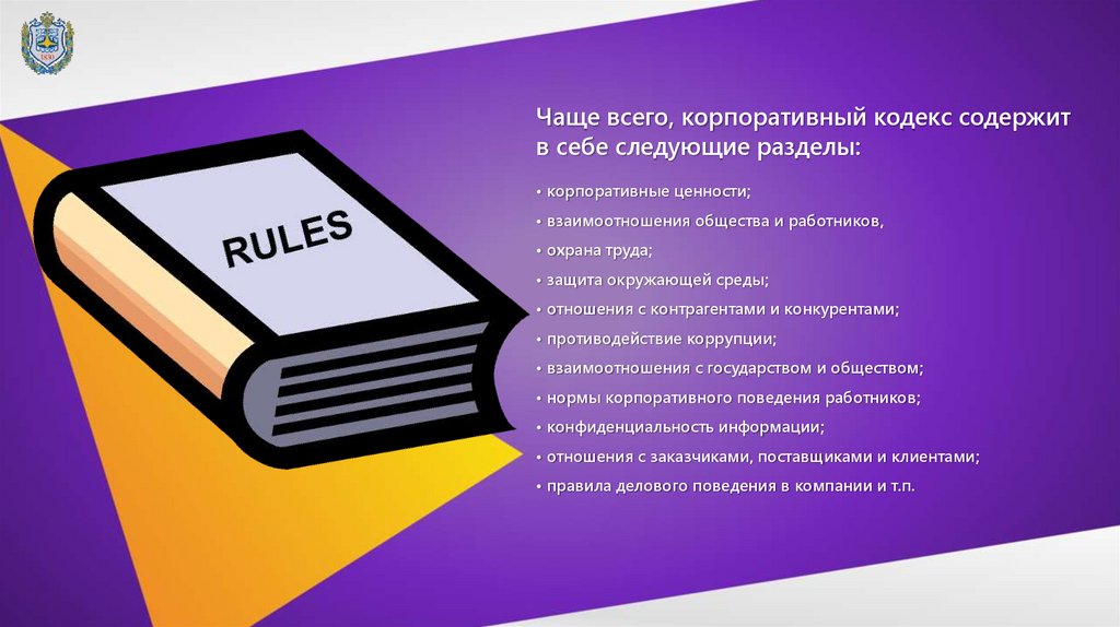 Чаще всего, корпоративный кодекс содержитв себе следующие разделы: