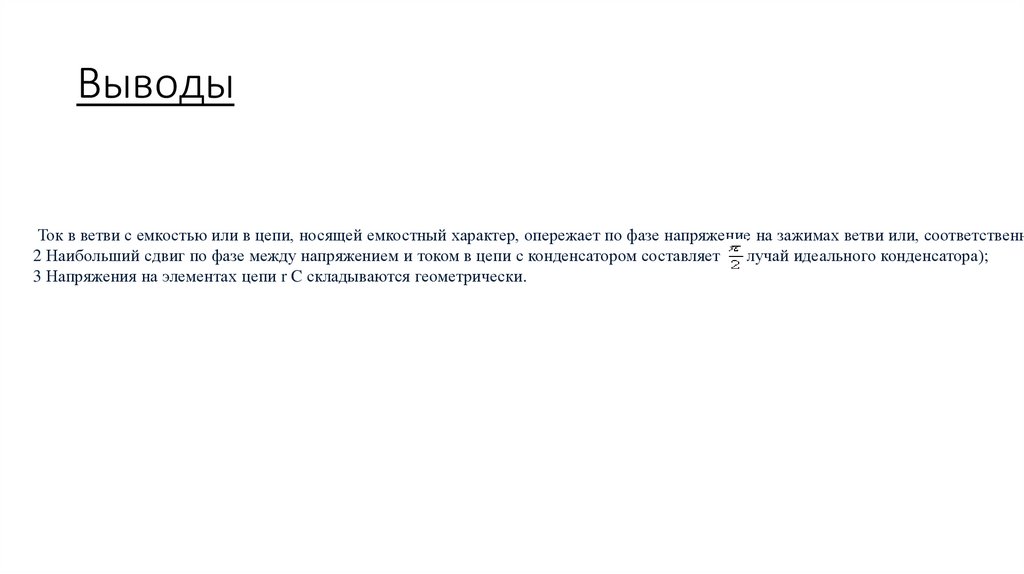 ВыводыТок в ветви с емкостью или в цепи, носящей емкостный характер, опережает по фазе напряжение на зажимах ветви или, соответственн