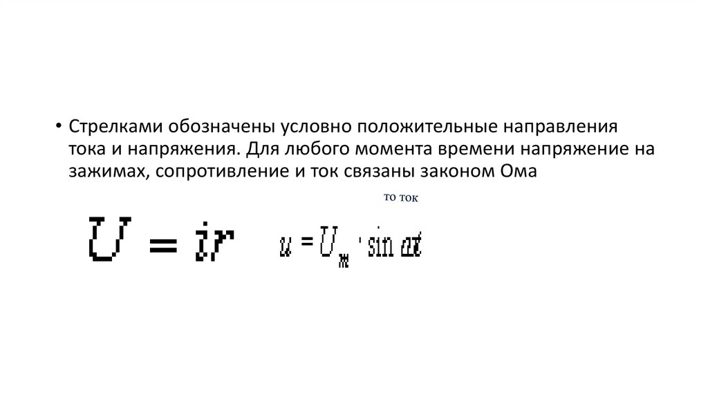 • Стрелками обозначены условно положительные направлениятока и напряжения. Для любого момента времени напряжение на