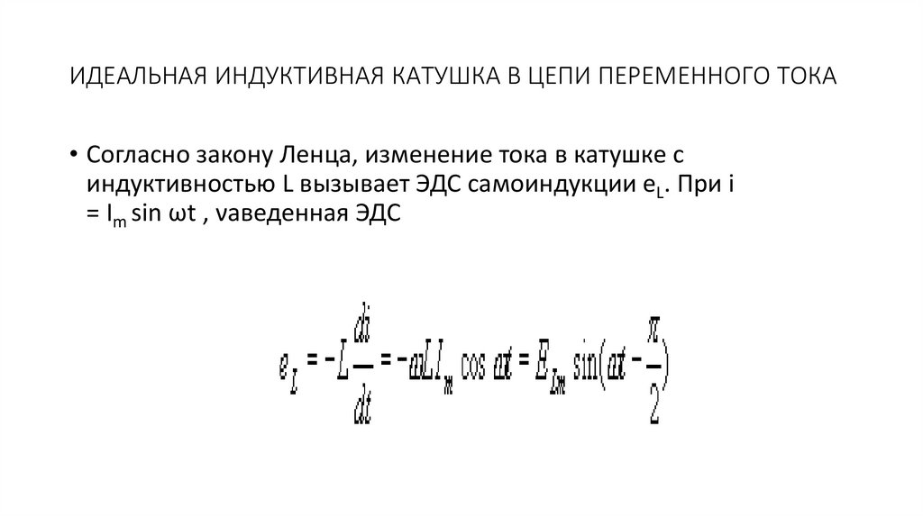 ИДЕАЛЬНАЯ ИНДУКТИВНАЯ КАТУШКА В ЦЕПИ ПЕРЕМЕННОГО ТОКА• Согласно закону Ленца, изменение тока в катушке с