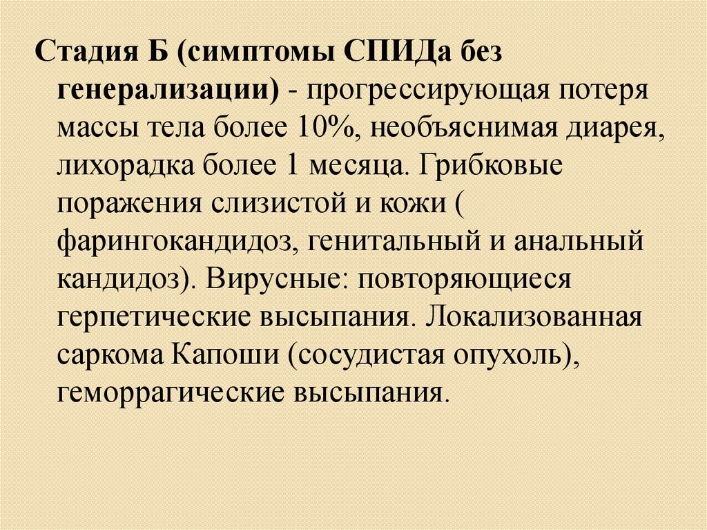 Стадия Б (симптомы СПИДа безгенерализации) - прогрессирующая потеря