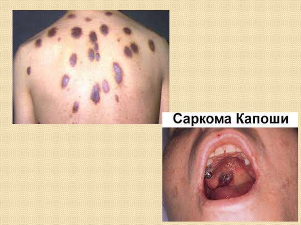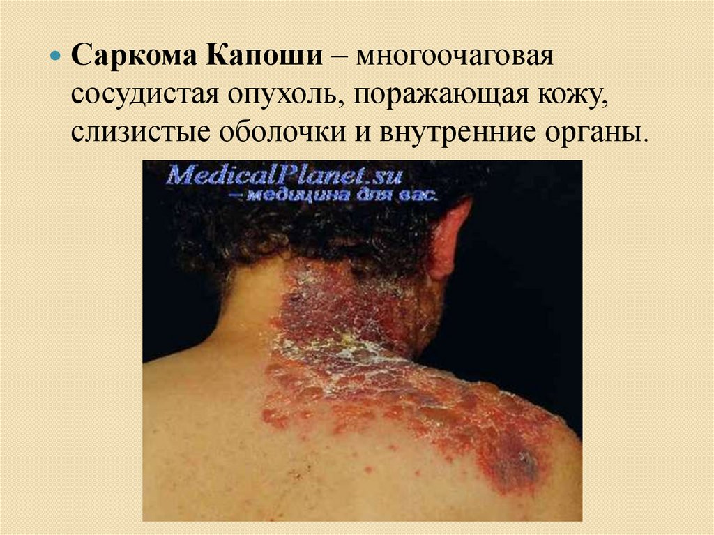 Саркома Капоши – многоочаговаясосудистая опухоль, поражающая кожу,