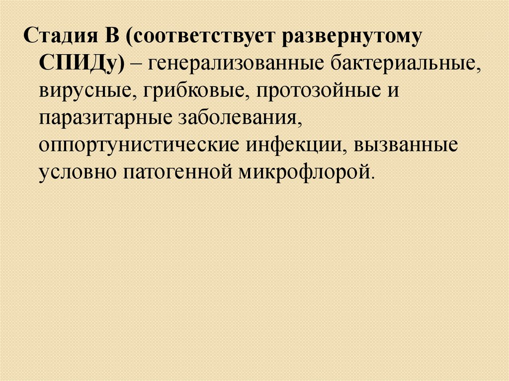 Стадия В (соответствует развернутомуСПИДу) – генерализованные бактериальные,