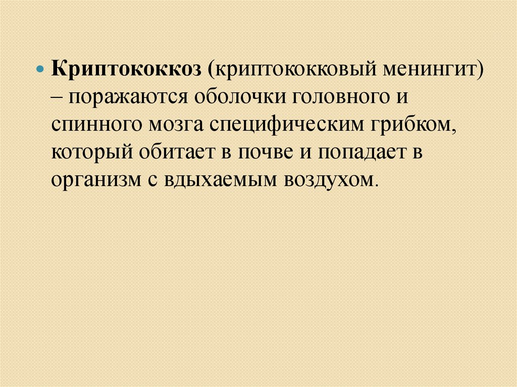 Криптококкоз (криптококковый менингит)– поражаются оболочки головного и