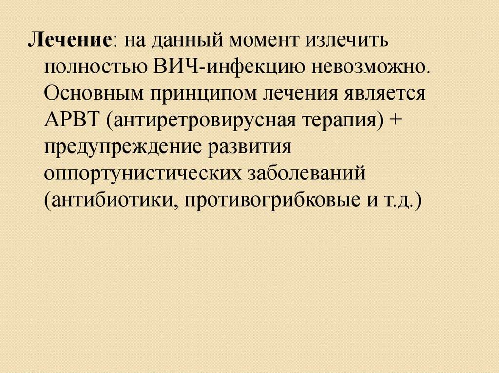 Лечение: на данный момент излечитьполностью ВИЧ-инфекцию невозможно.