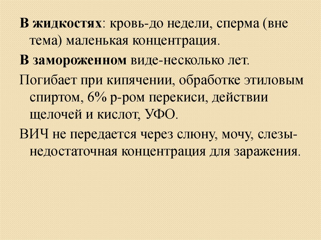 ВИЧ не передается через слюну, мочу, слезынедостаточная концентрация для заражения.