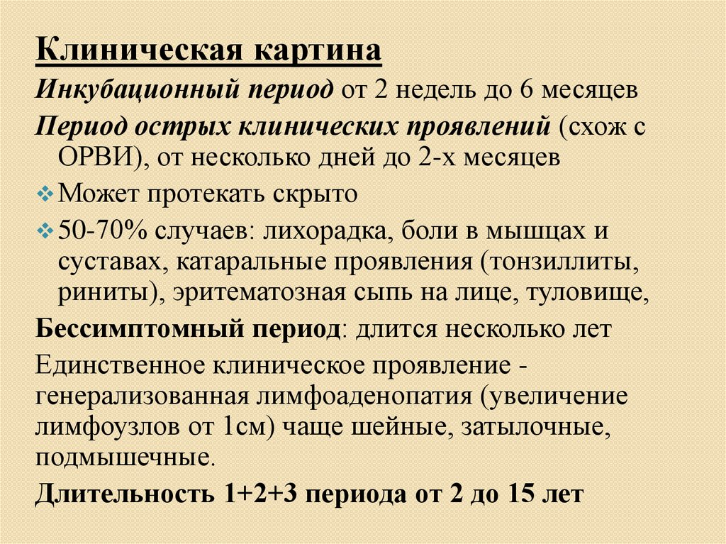 Клиническая картинаИнкубационный период от 2 недель до 6 месяцев