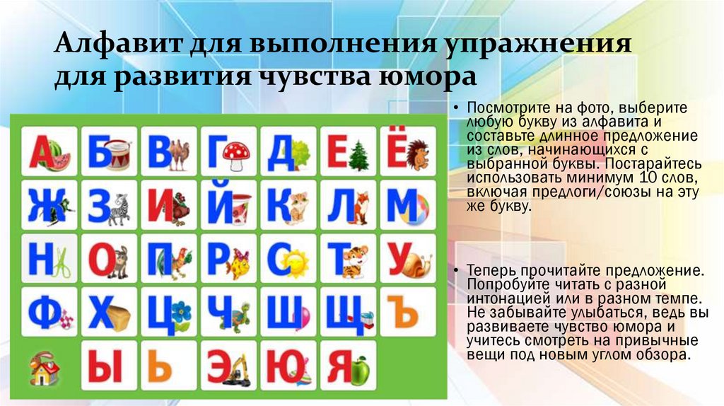Алфавит для выполнения упражнениядля развития чувства юмора