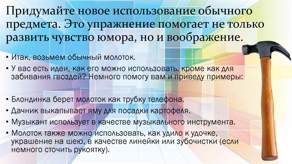 Придумайте новое использование обычногопредмета. Это упражнение помогает не только
