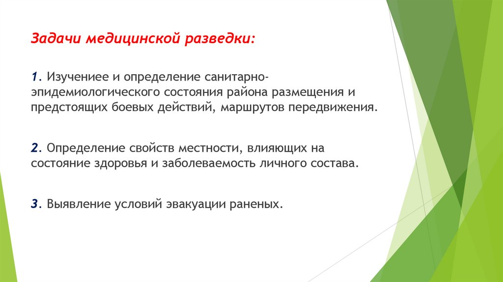 Задачи медицинской разведки:1. Изучениее и определение санитарноэпидемиологического состояния района размещения и
