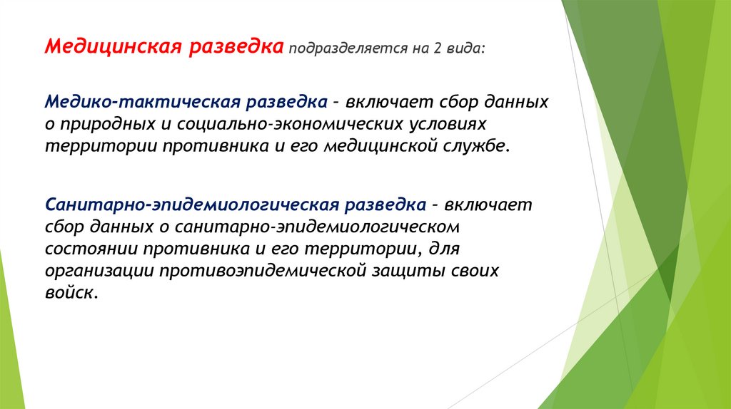 Медицинская разведка подразделяется на 2 вида:Медико-тактическая разведка – включает сбор данных