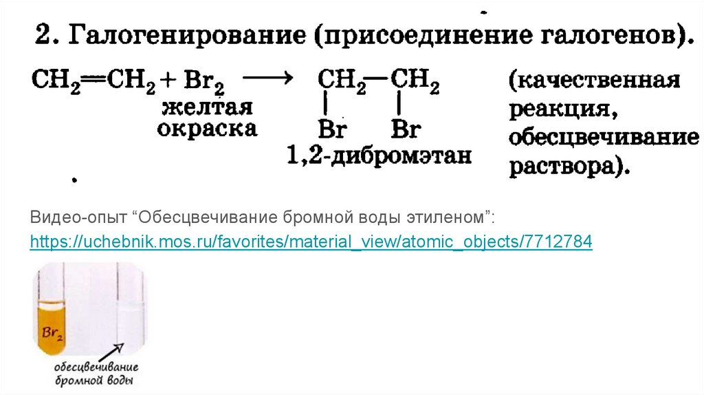 Видео-опыт “Обесцвечивание бромной воды этиленом”:https://uchebnik.mos.ru/favorites/material_view/atomic_objects/7712784