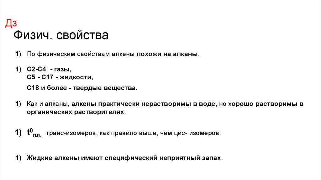 1) Как и алканы, алкены практически нерастворимы в воде, но хорошо растворимы в