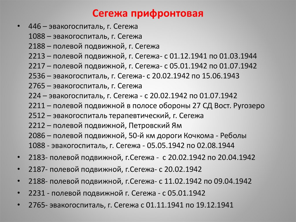 • 2765- эвакогоспиталь, г. Сегежа с 01.11.1941 по 19.12.1941