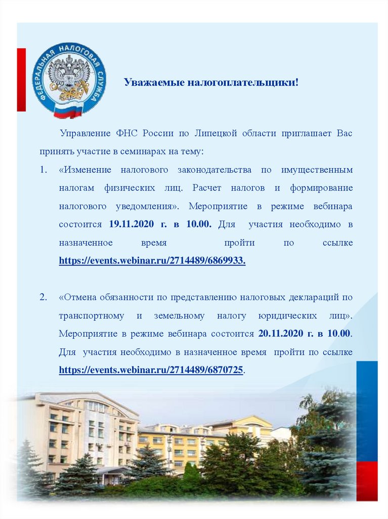 Уважаемые налогоплательщики!Управление ФНС России по Липецкой области приглашает Вас