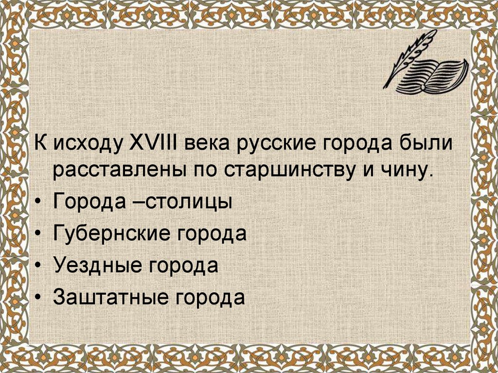 К исходу XVIII века русские города былирасставлены по старшинству и чину.