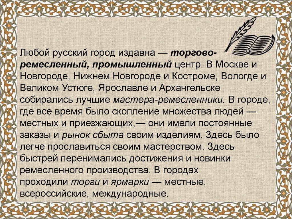 Любой русский город издавна — торговоремесленный, промышленный центр. В Москве иНовгороде, Нижнем Новгороде и Костроме, Вологде и
