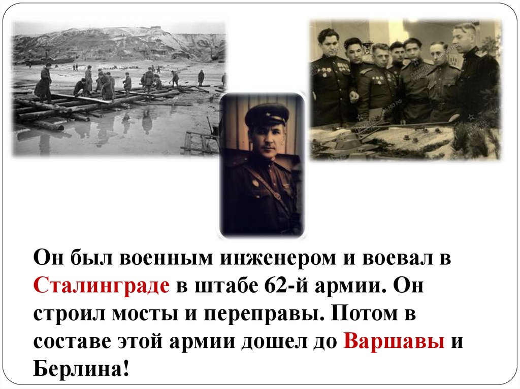 Он был военным инженером и воевал вСталинграде в штабе 62-й армии. Он