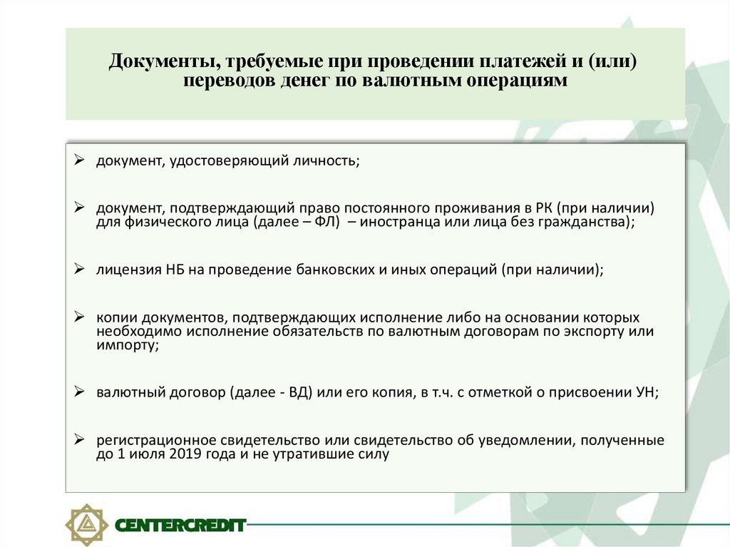Документы, требуемые при проведении платежей и (или)переводов денег по валютным операциям