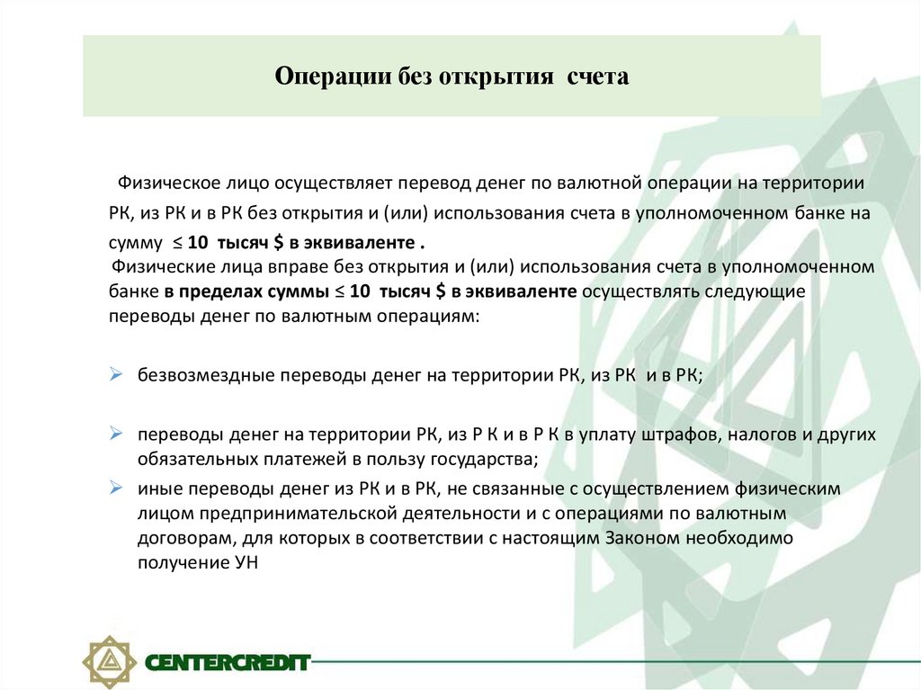РК, из РК и в РК без открытия и (или) использования счета в уполномоченном банке на