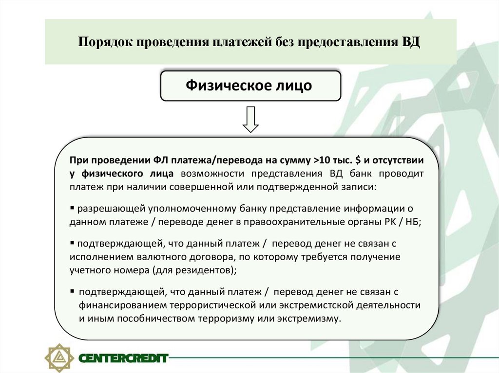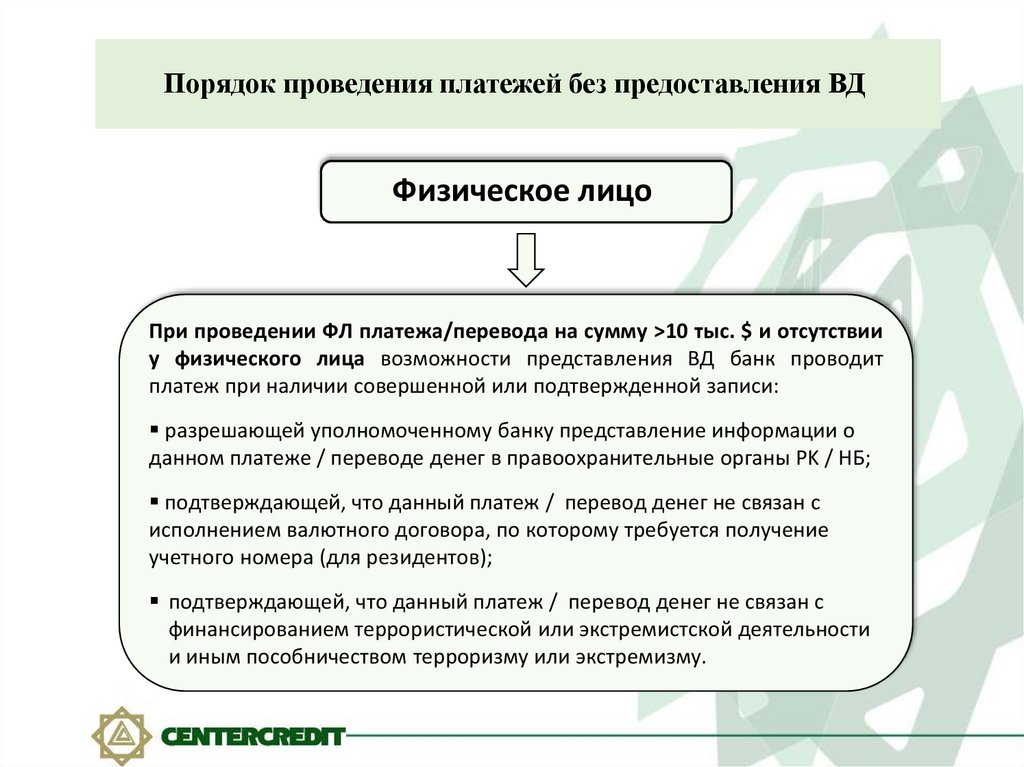 Порядок проведения платежей без предоставления ВДФизическое лицо