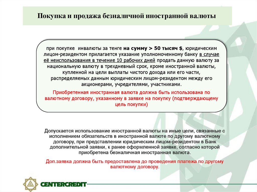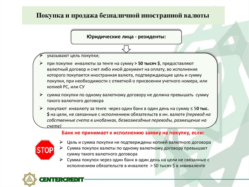 Покупка и продажа безналичной иностранной валютыпри покупке инвалюты за тенге на сумму > 50 тысяч $, юридическим