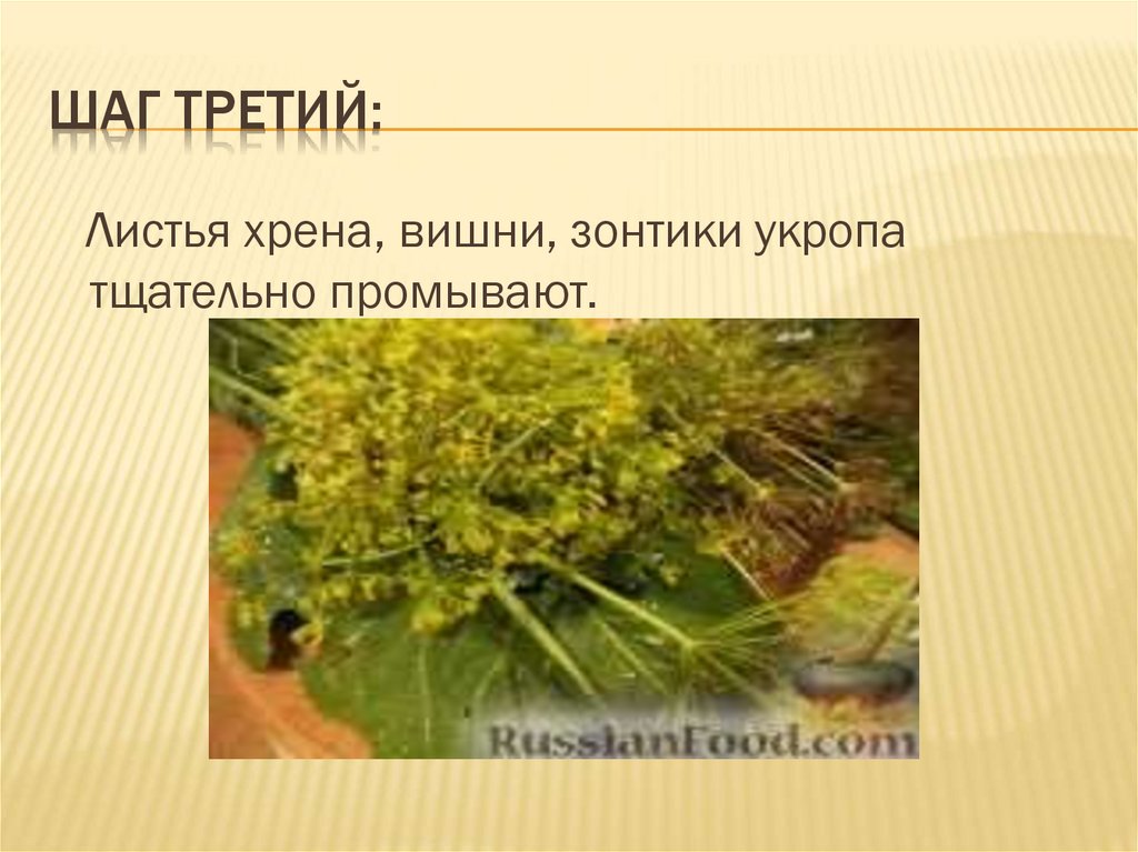 ШАГ ТРЕТИЙ:Листья хрена, вишни, зонтики укропа