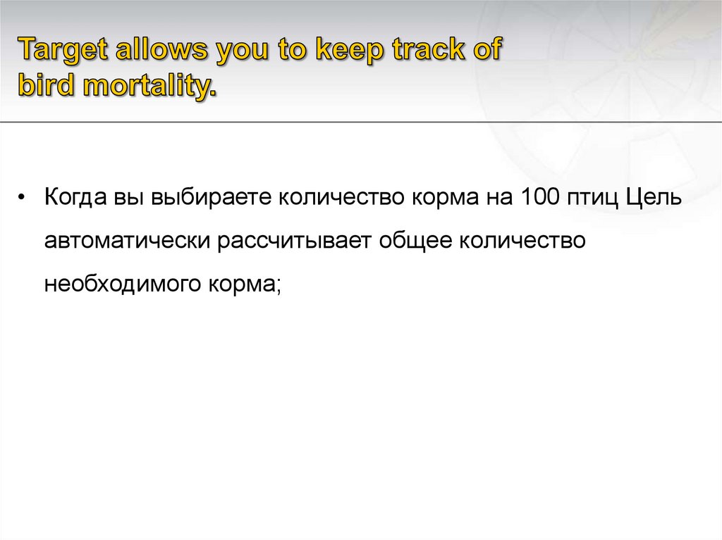 • Когда вы выбираете количество корма на 100 птиц Цельавтоматически рассчитывает общее количество