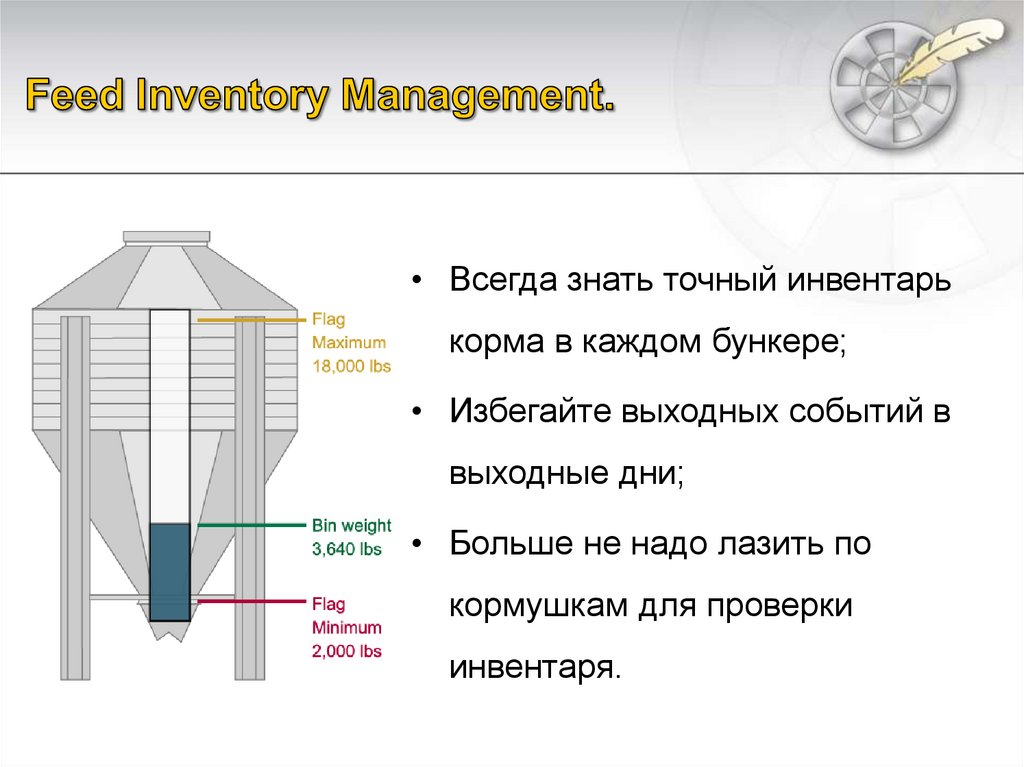 • Всегда знать точный инвентарькорма в каждом бункере;