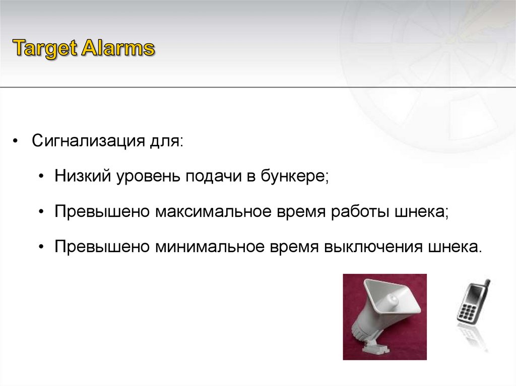 • Сигнализация для:• Низкий уровень подачи в бункере;