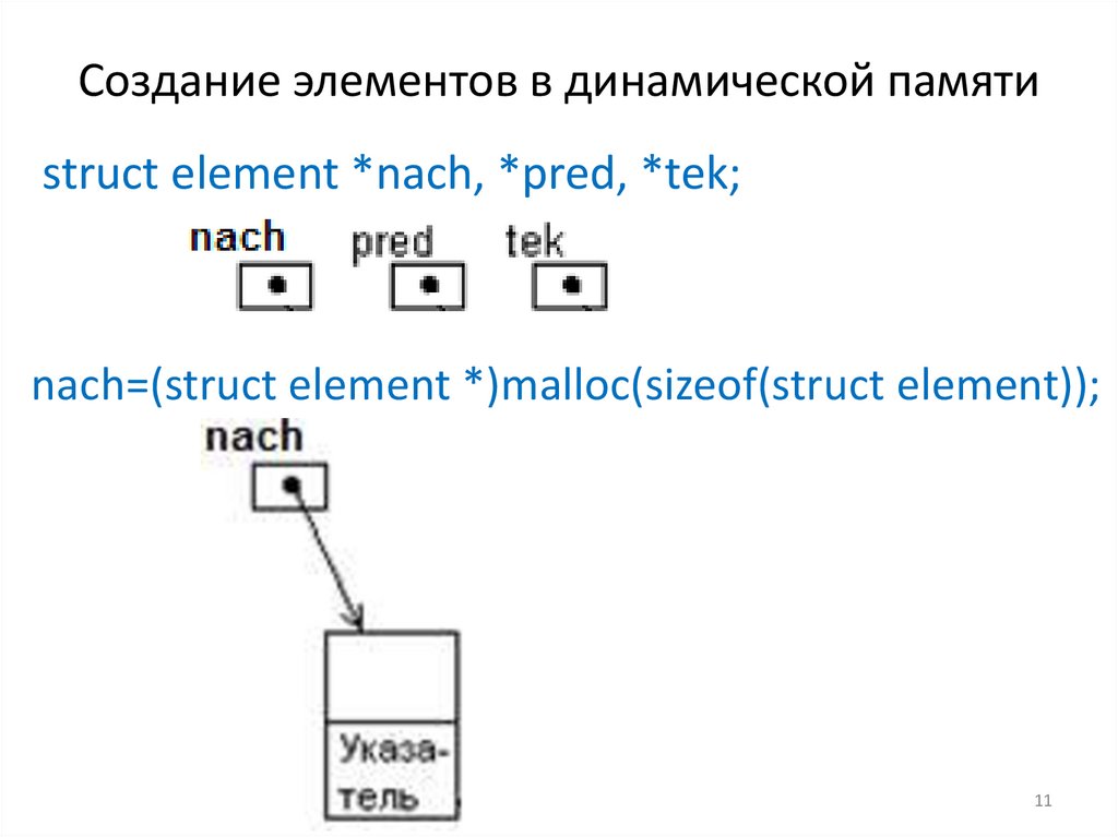 Создание элементов в динамической памятиstruct element *nach, *pred, *tek;