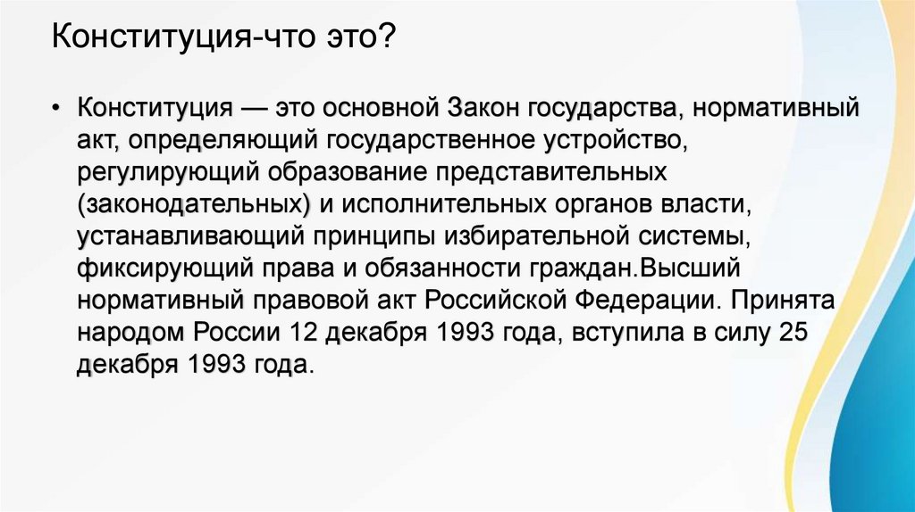 Конституция-что это?• Конституция — это основной Закон государства, нормативный