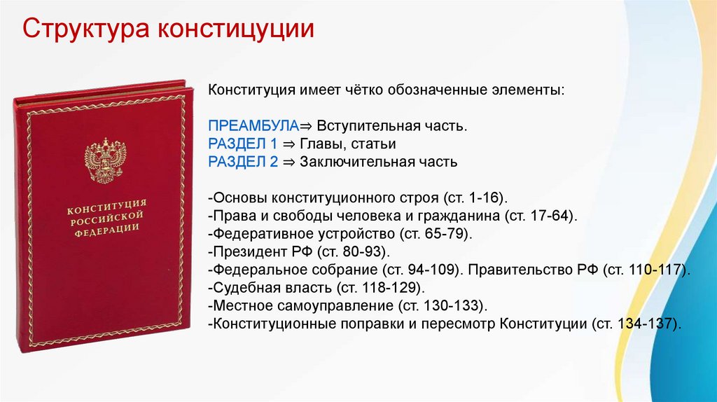 Структура констицуцииКонституция имеет чётко обозначенные элементы: