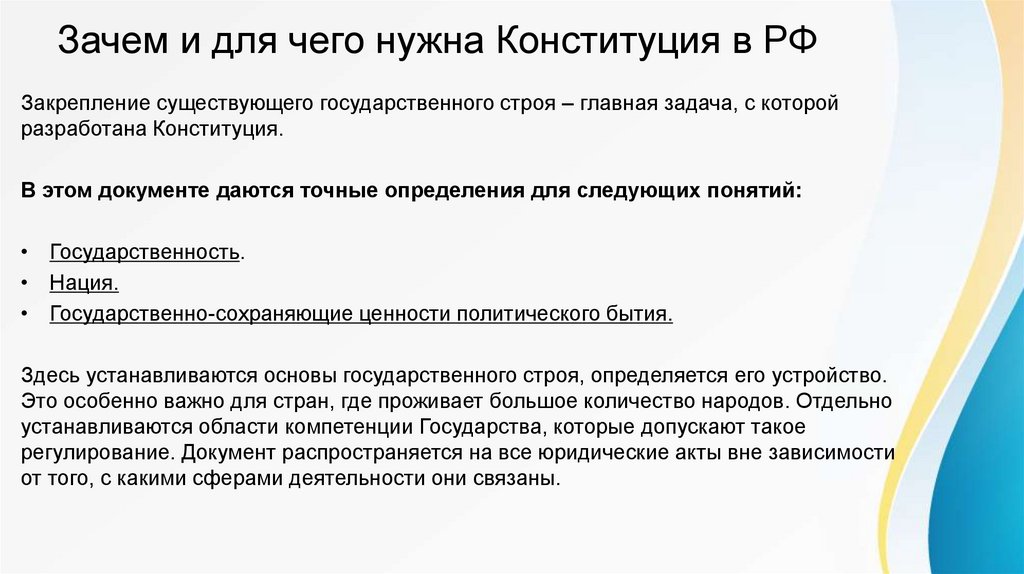 Зачем и для чего нужна Конституция в РФЗакрепление существующего государственного строя – главная задача, с которой