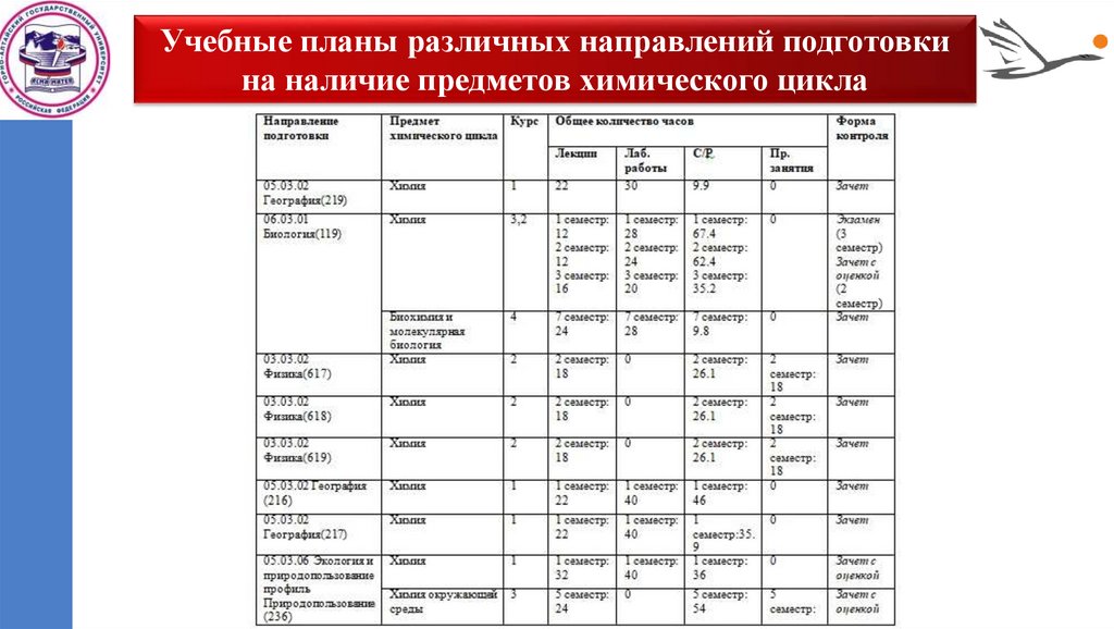 Учебные планы различных направлений подготовкина наличие предметов химического цикла
