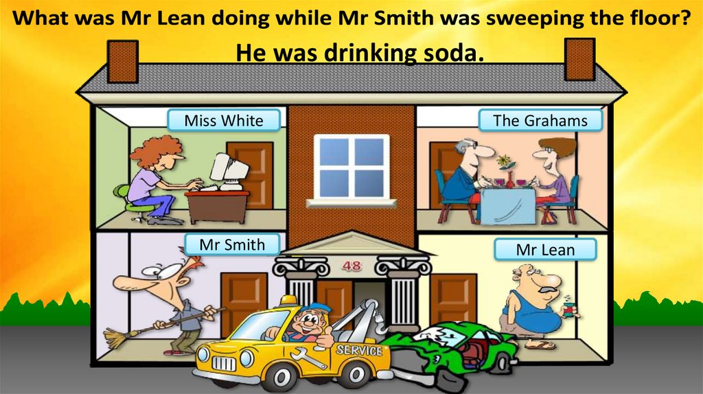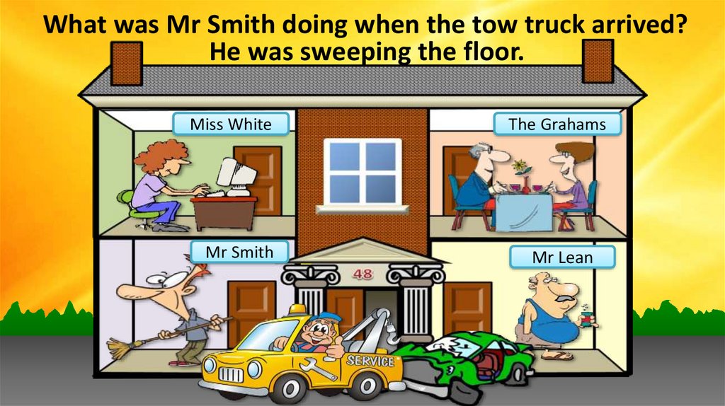 What was Mr Smith doing when the tow truck arrived?He was sweeping the floor.