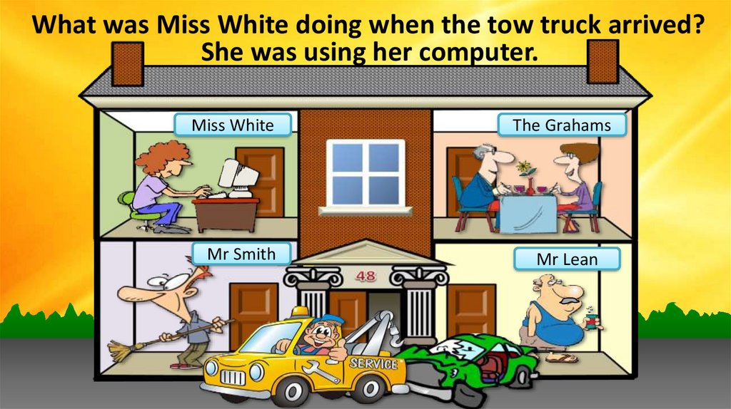 What was Miss White doing when the tow truck arrived?She was using her computer.