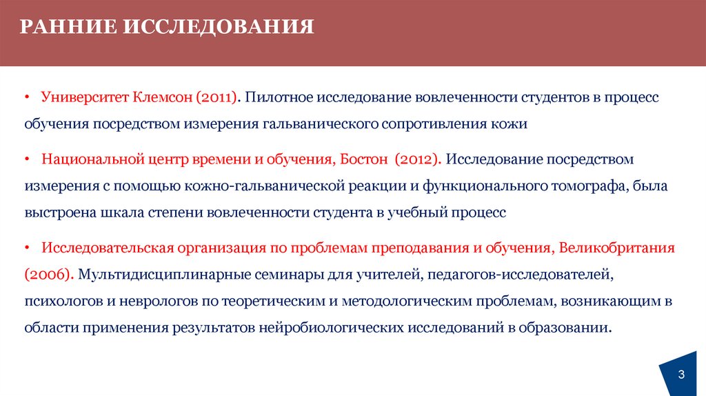 РАННИЕ ИССЛЕДОВАНИЯ• Университет Клемсон (2011). Пилотное исследование вовлеченности студентов в процесс